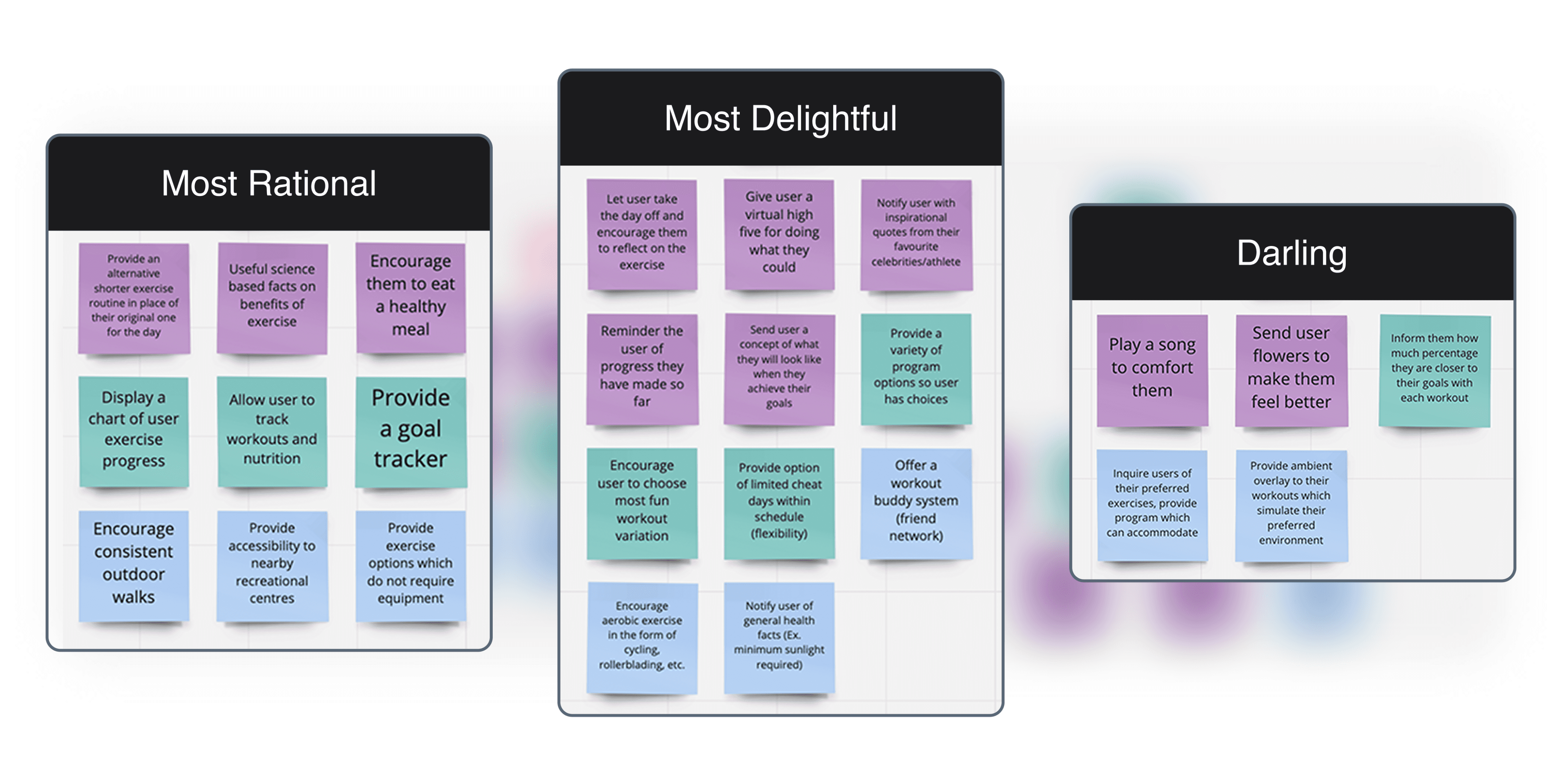 Through an affinity mapping process, participants' pain points and exercise preferences were discovered. Participants' unanimous enjoyment of increased energy, wakefulness, and better mood provided valuable insights, paving way for common patterns in their responses to be uncovered. These patterns included their exercise history, encountered problems, helpful factors, preferred environments, motivations, habits, and insightful quotes.