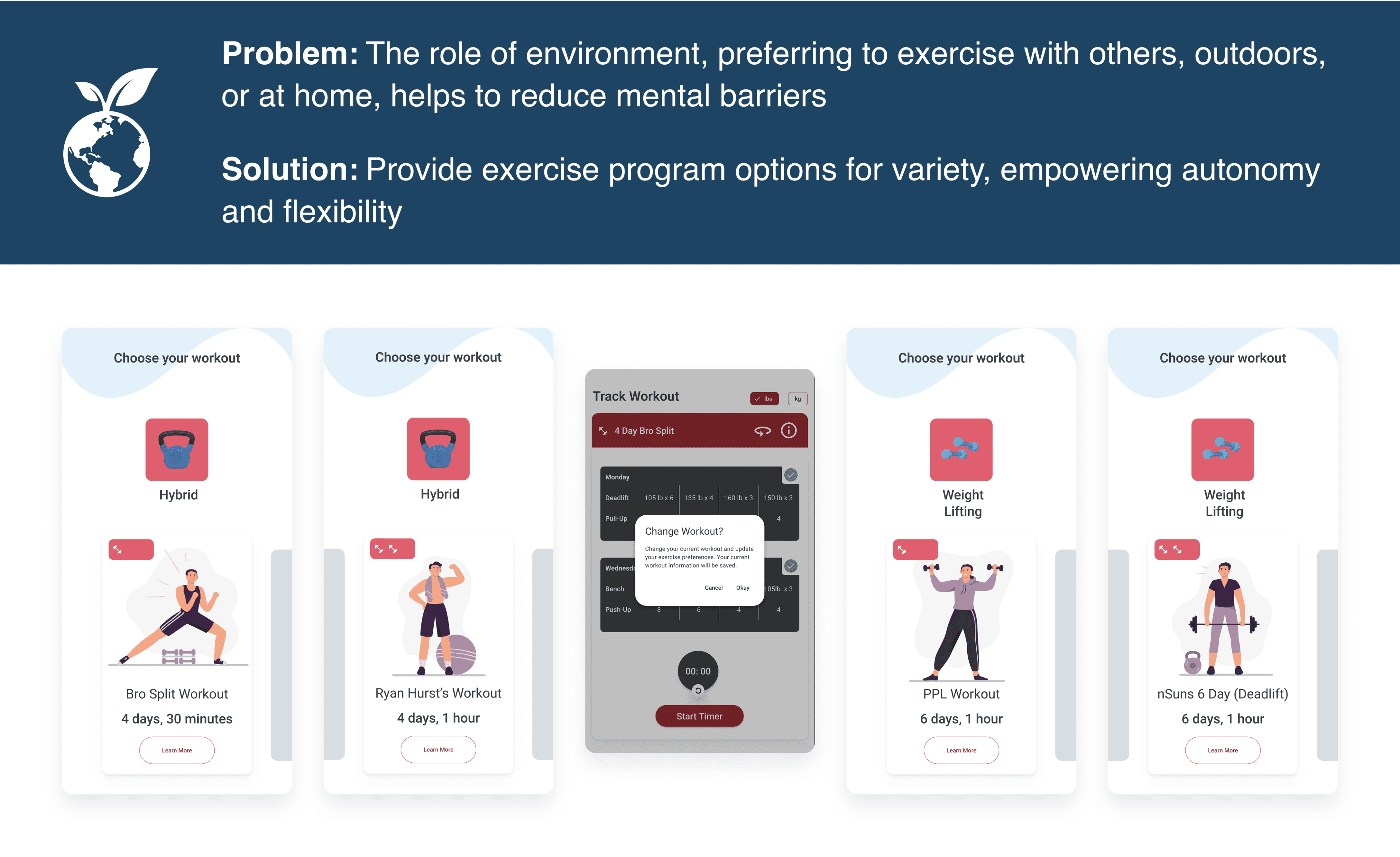 Research showed that self-efficacy, or the belief in one's ability to perform an action, is crucial in maintaining regular exercise habits. Goal-setting difficulties, and lack of intrinsic motivation were also primary reasons for low adherence. Based on these findings, I prioritized creating a service that addresses these concerns by providing assistance to novice exercisers in achieving their fitness goals and simplifying the workout program selection process.