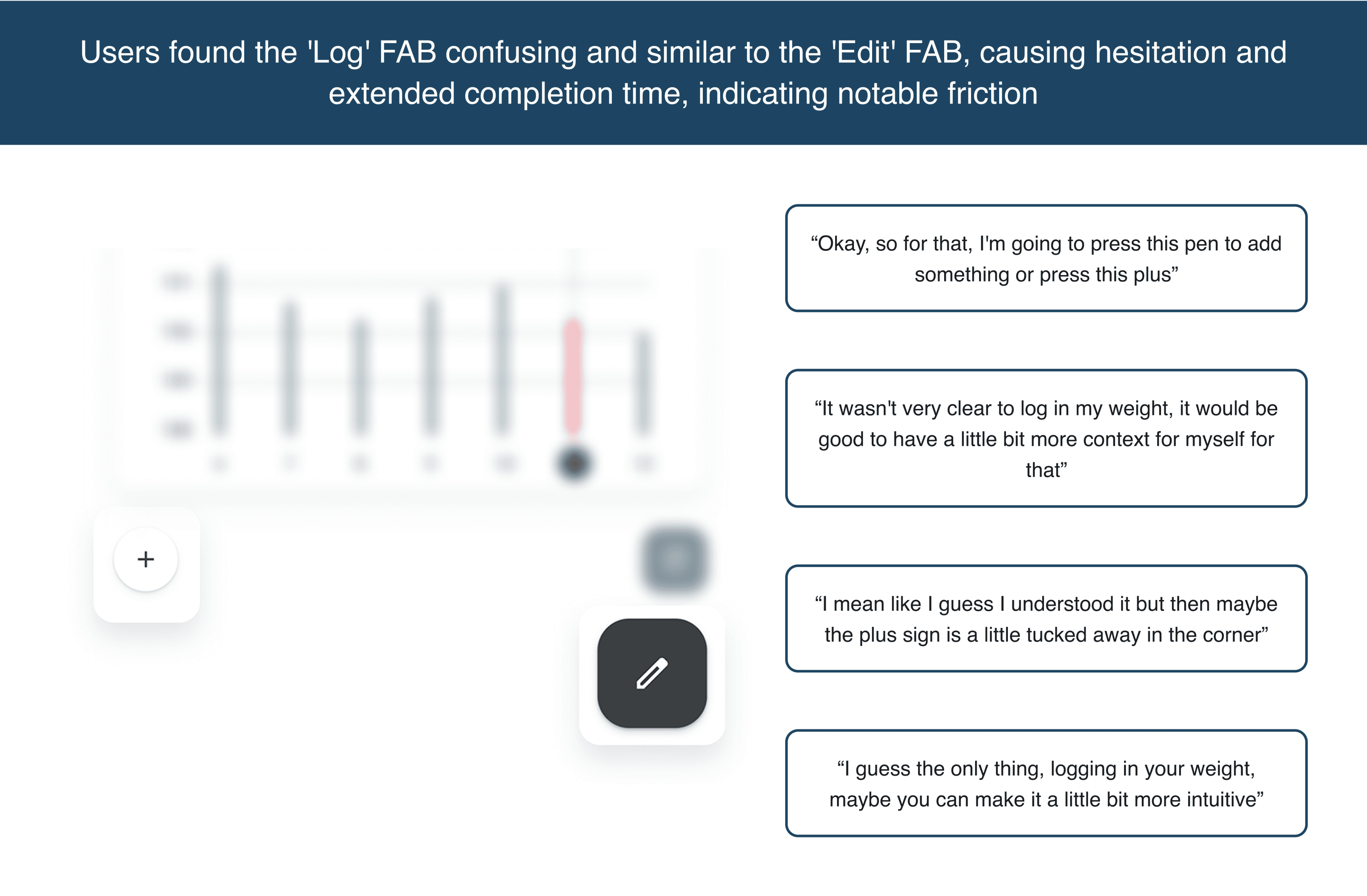 Users found the 'Log' FAB confusing and similar to the 'Edit' FAB, causing hesitation and extended completion time, indicating notable friction