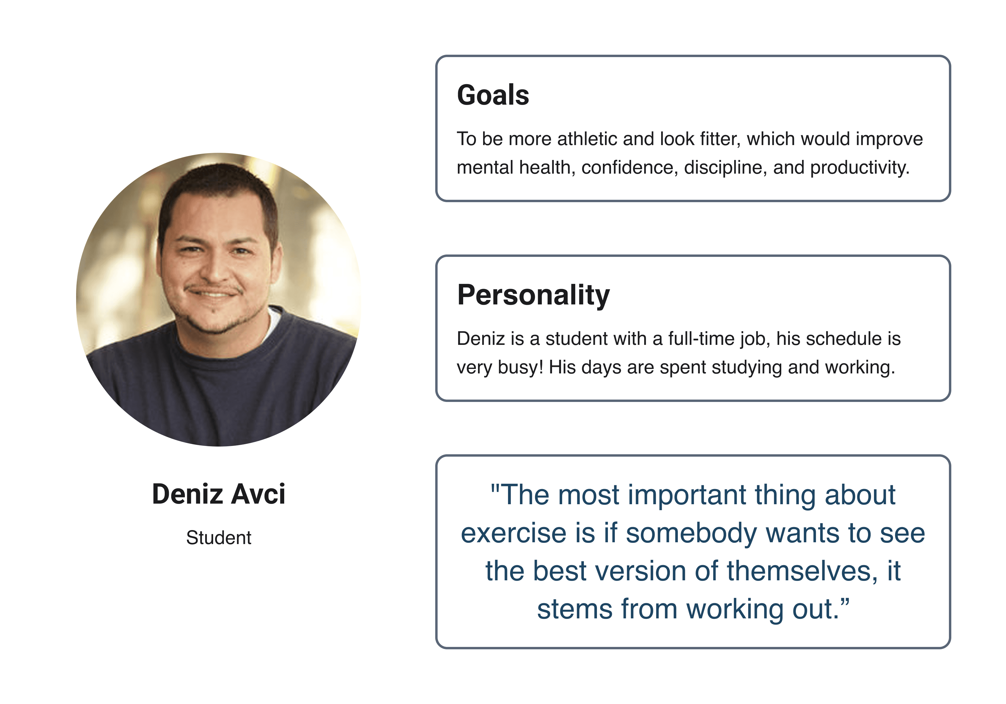 Crafting a user persona helped me reconnect with my target audience and their common struggles. It dawned on me that a wide range of people could be potential users since many share a desire to enhance their well-being and avoid aging. While the persona acts as a reference, it's the shared emotions and perceptions that give it substance. This reinforced the need for a methodical approach to ensure a top-notch user experience with fitness.