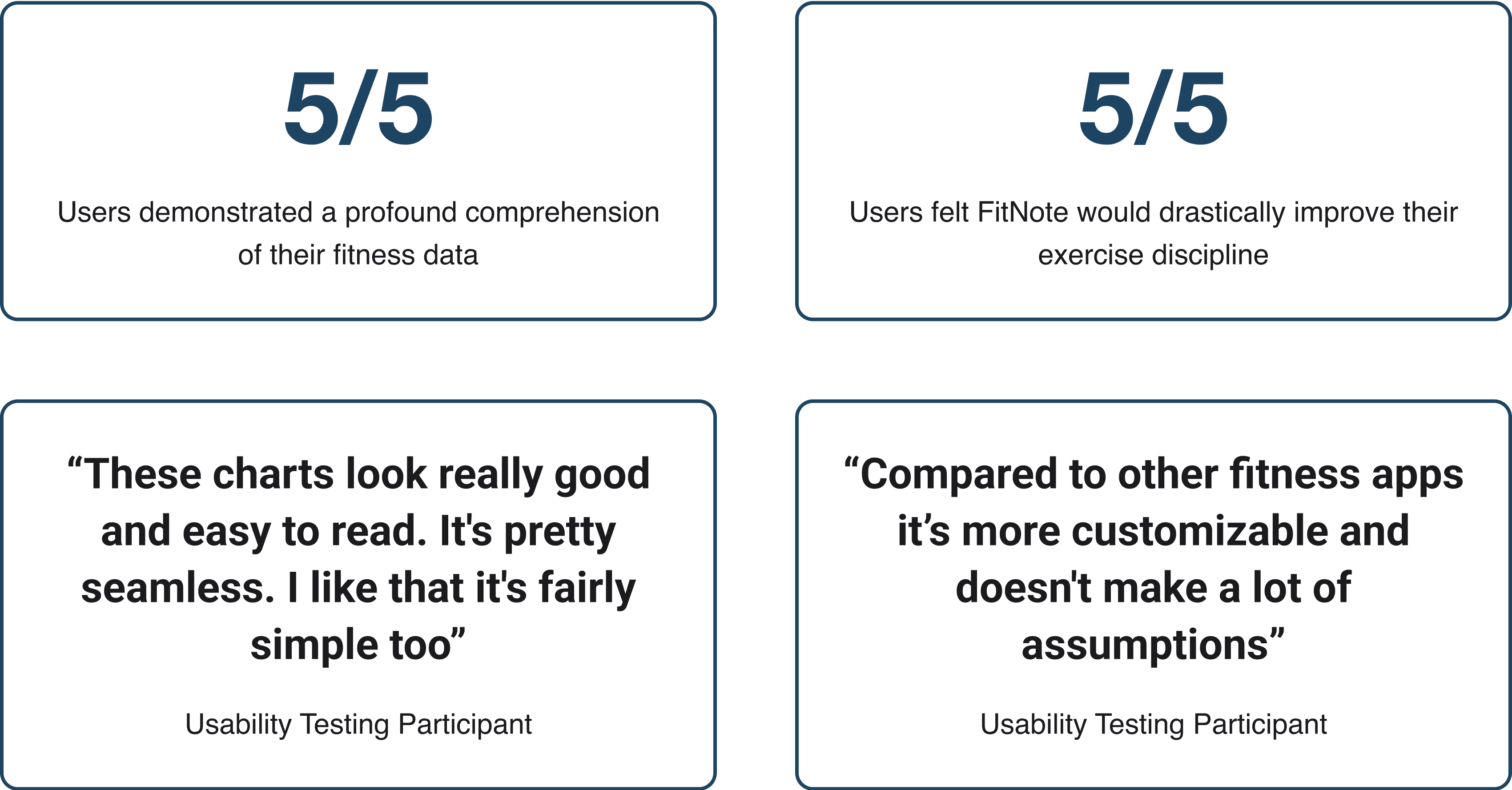 Impact: 5/5 users demonstrated a profound comprehension of their fitness data; 5/5 users felt FitNote would drastically improve their exercise discipline