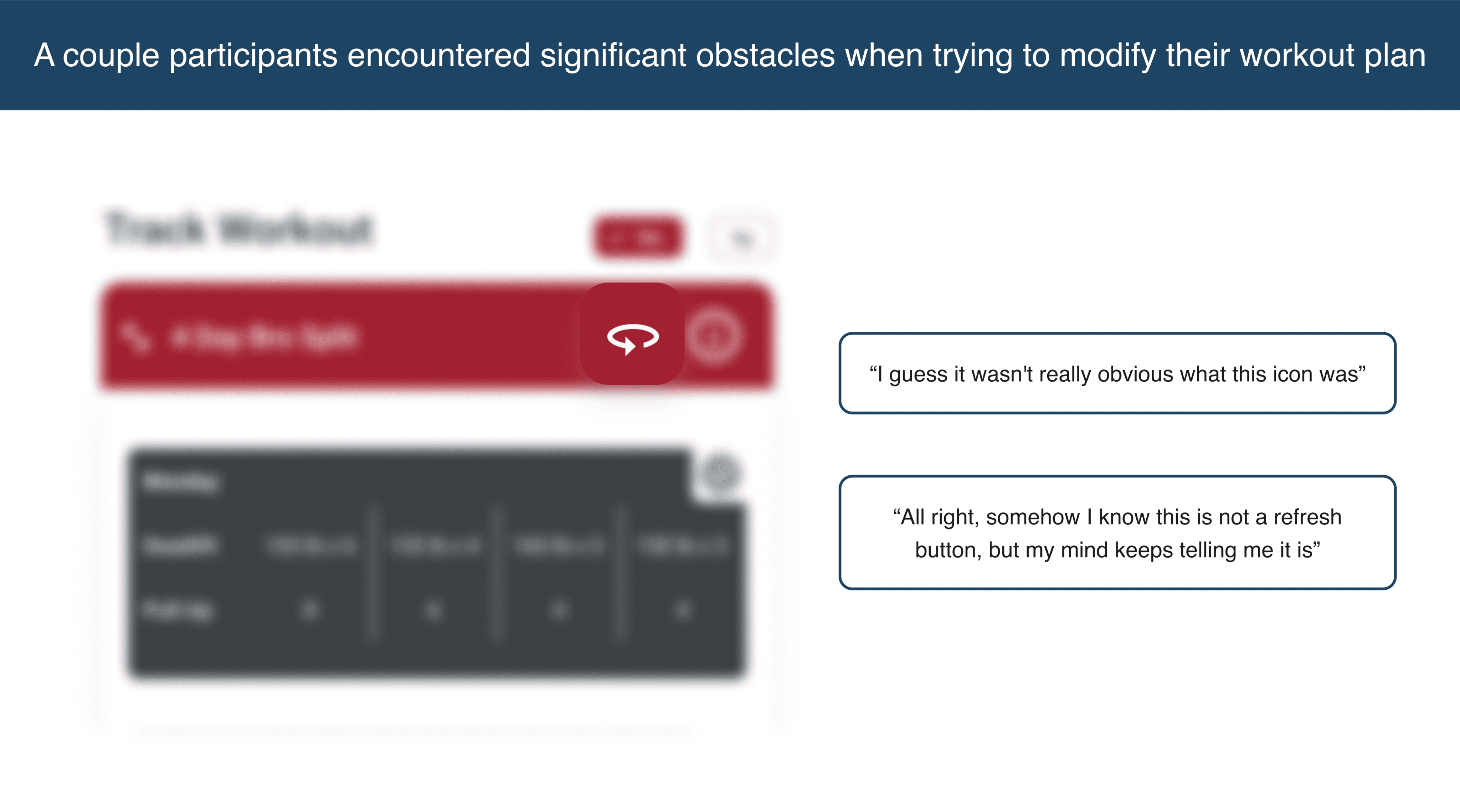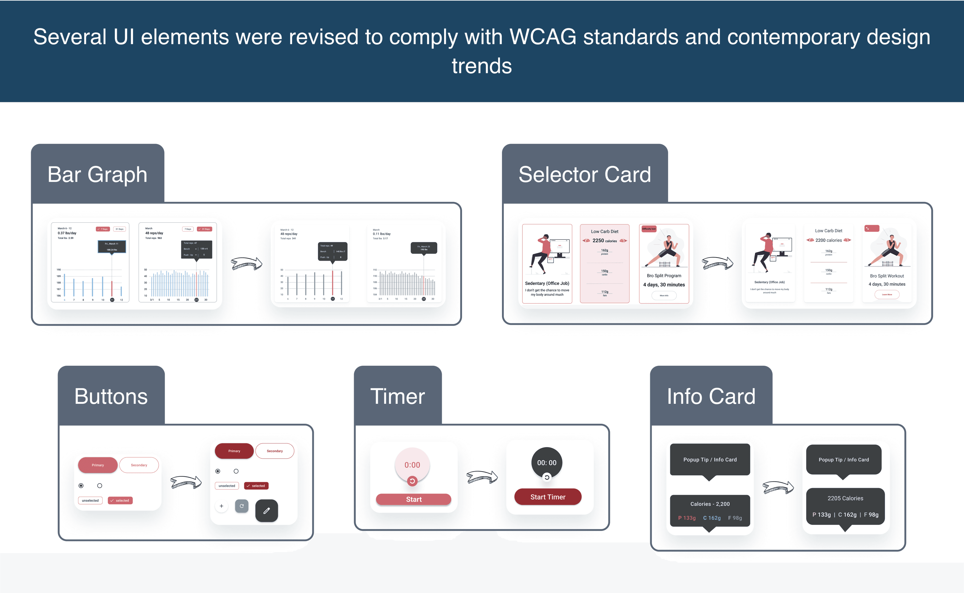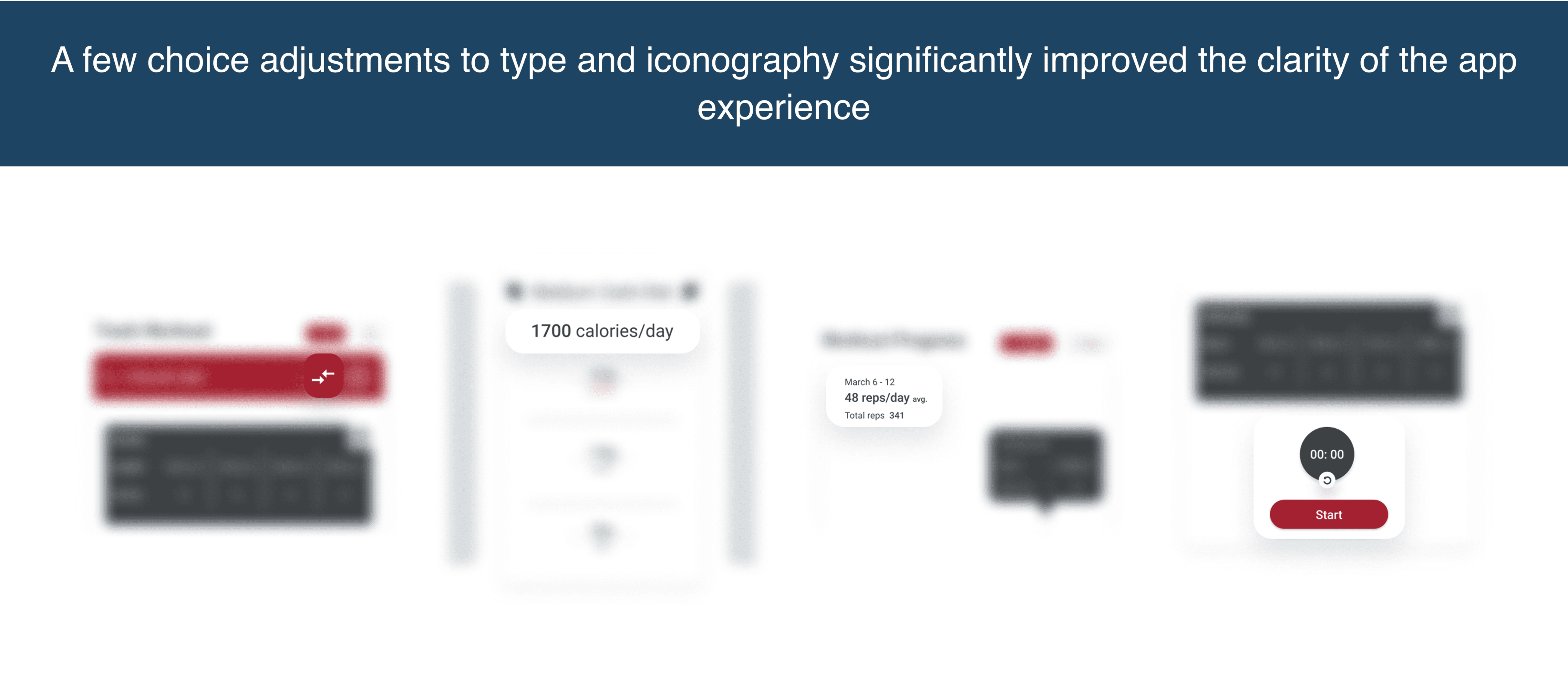 It was evident that users had trouble with typography and iconography on the charts, onboarding, and timer. Changes were made to improve readability and clarity, including adding type for chart averages and daily calorie intake, simplifying the type for the timer, and clarifying the iconography of the 'Change Workout' CTA.