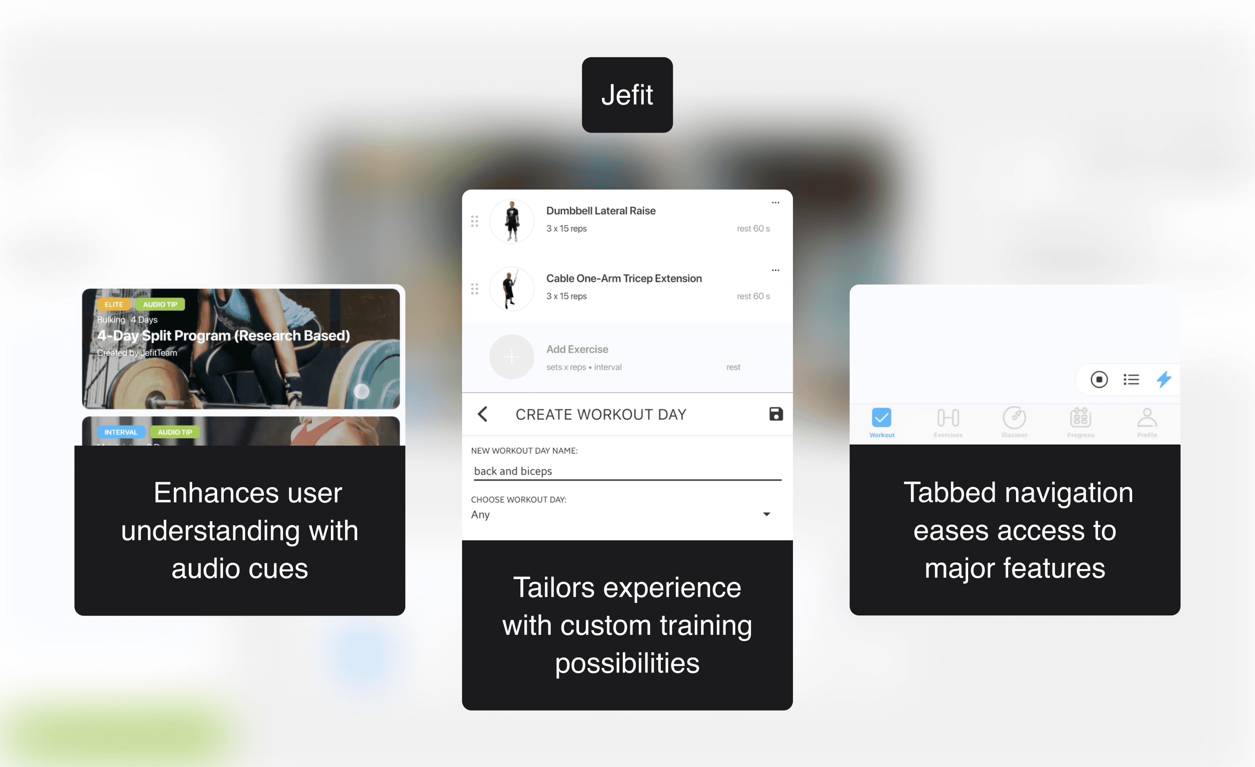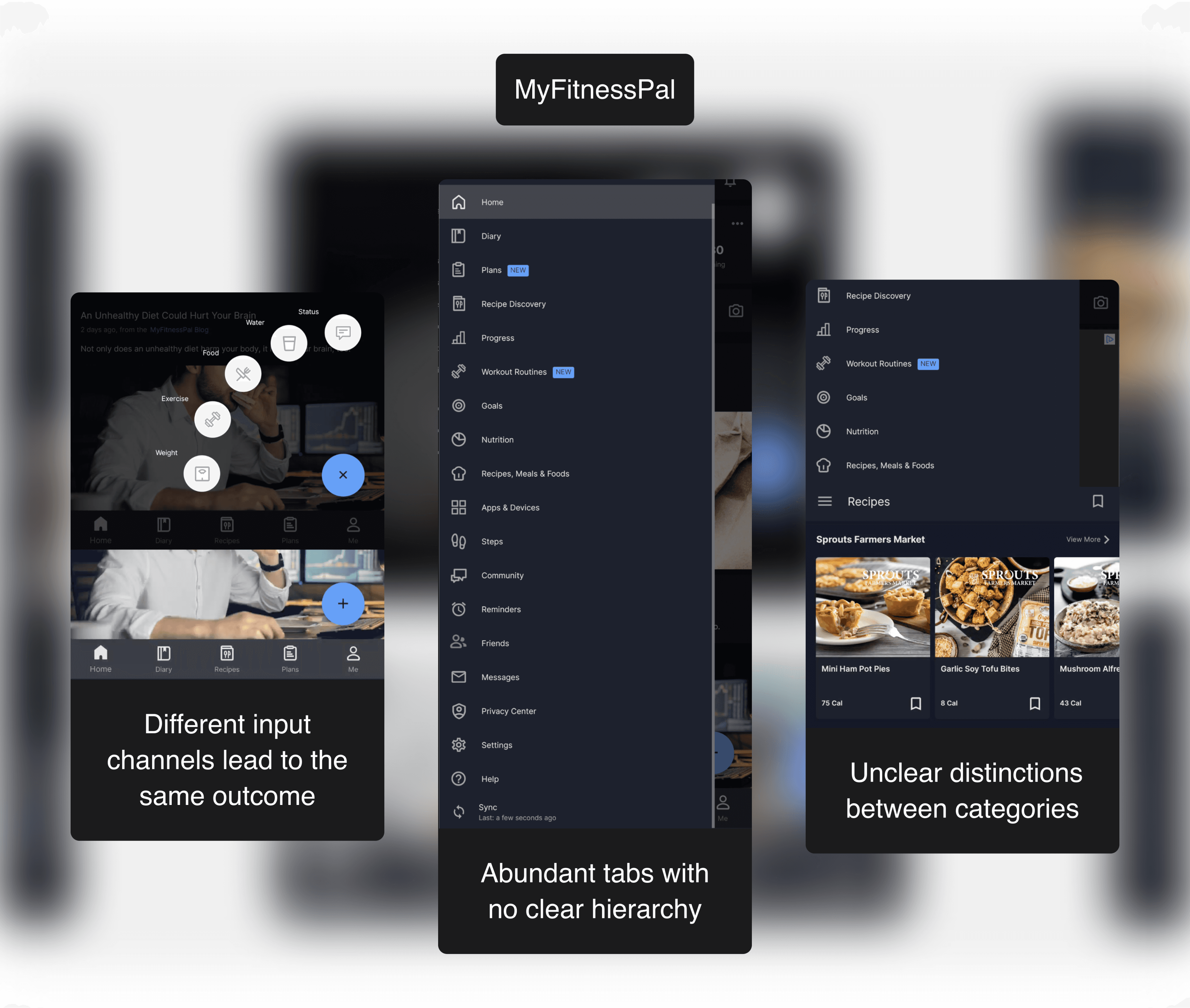 Through competitive analysis, I learned that similar features across different services can vary greatly in their implementation, from poor to excellent. For instance, MyFitnessPal's use of tabbed interfaces and floating action buttons created a confusing experience, while Jefit was more organized with clearer information architecture. This taught me to be aware of how such features are applied and to prioritize a streamlined implementation to avoid a bloated user experience.