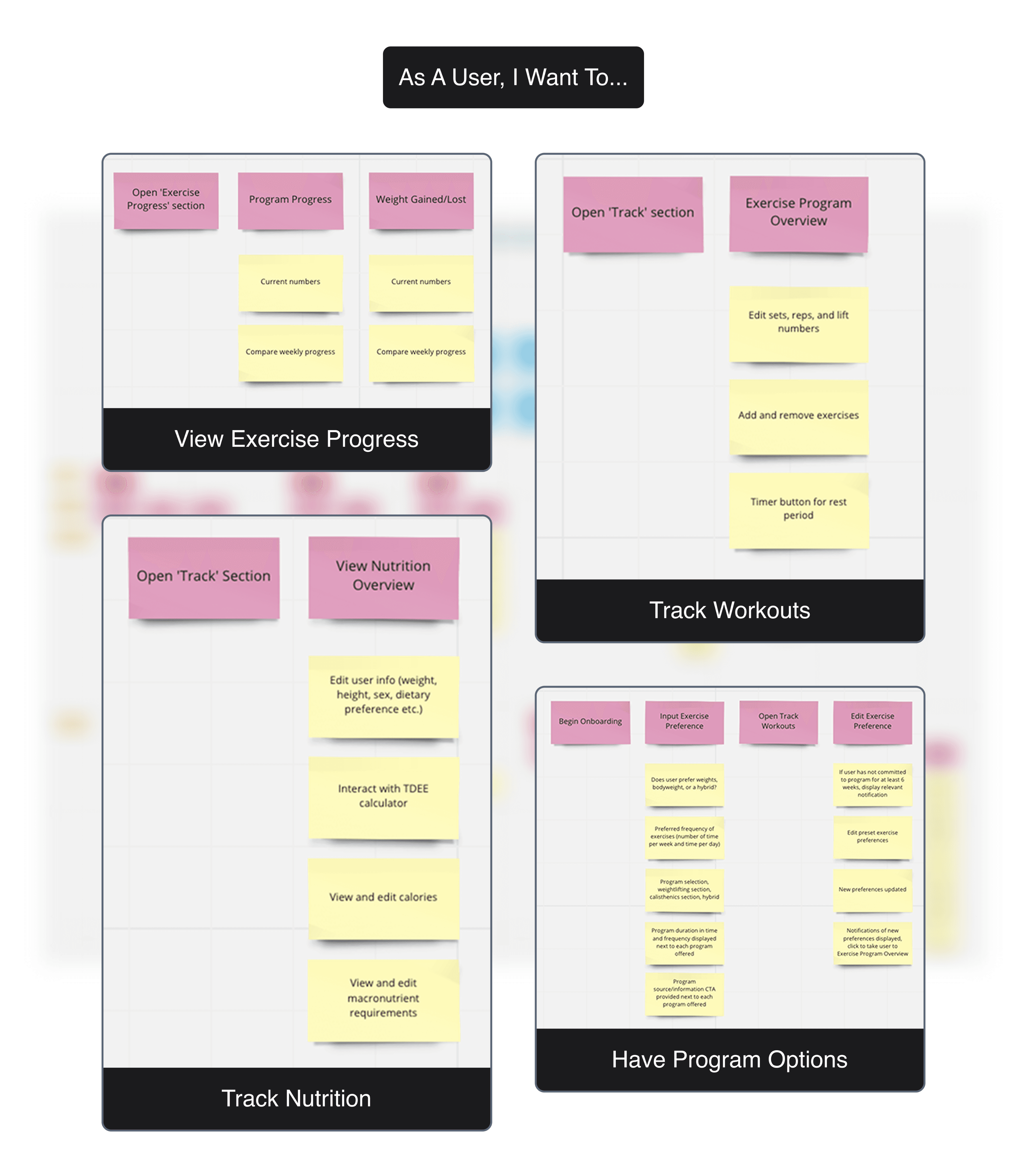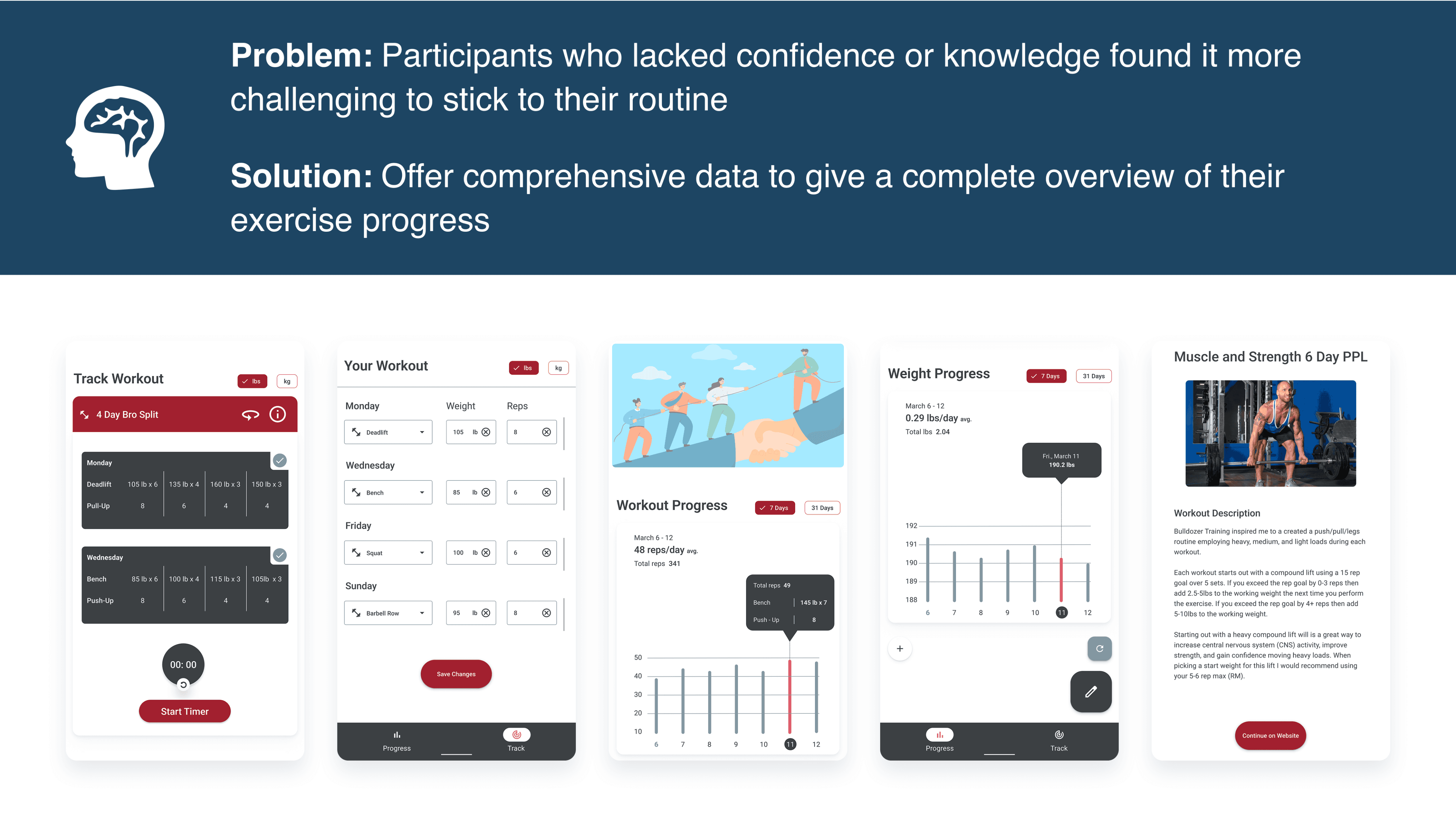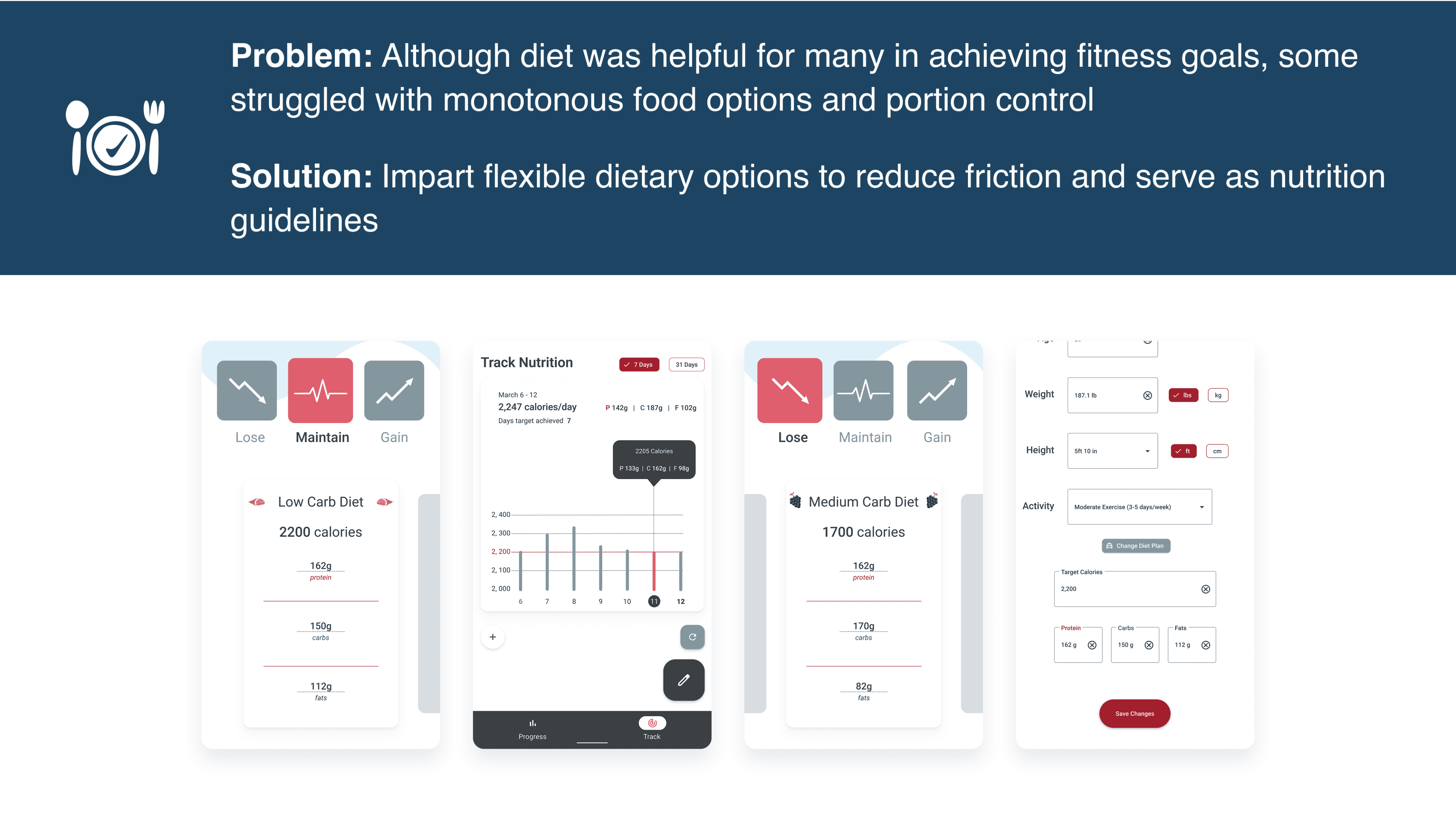 This resulted in the selection of four MVP features that were driven by providing the fundamentals of fitness and nutrition with enough flexibility to ensure compatibility with any lifestyle. I learned that providing fewer high-quality features is better than multiple half-baked ones.