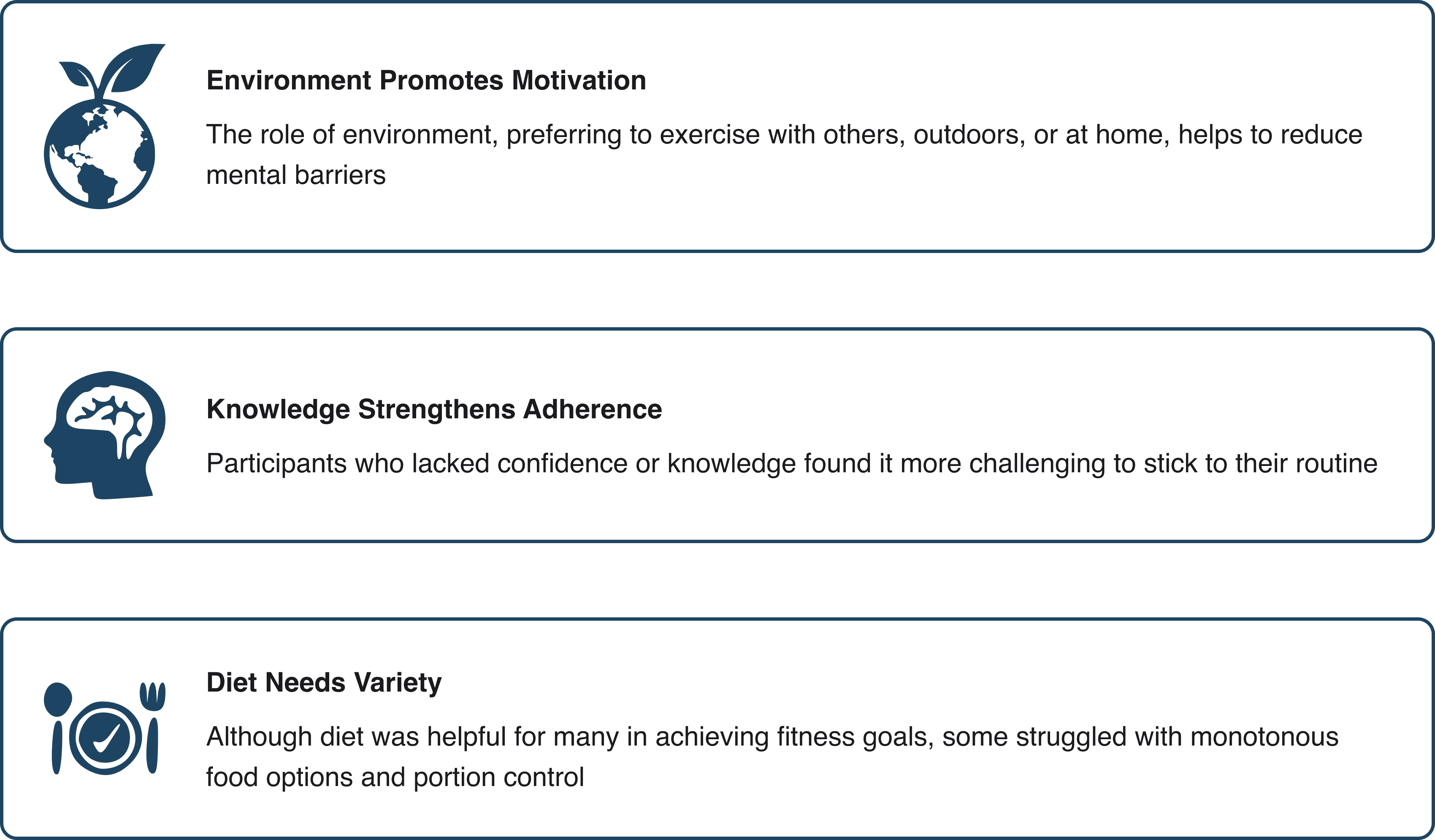 Through interviews with five participants, it became clear that three key areas were essential for maintaining a consistent exercise routine.