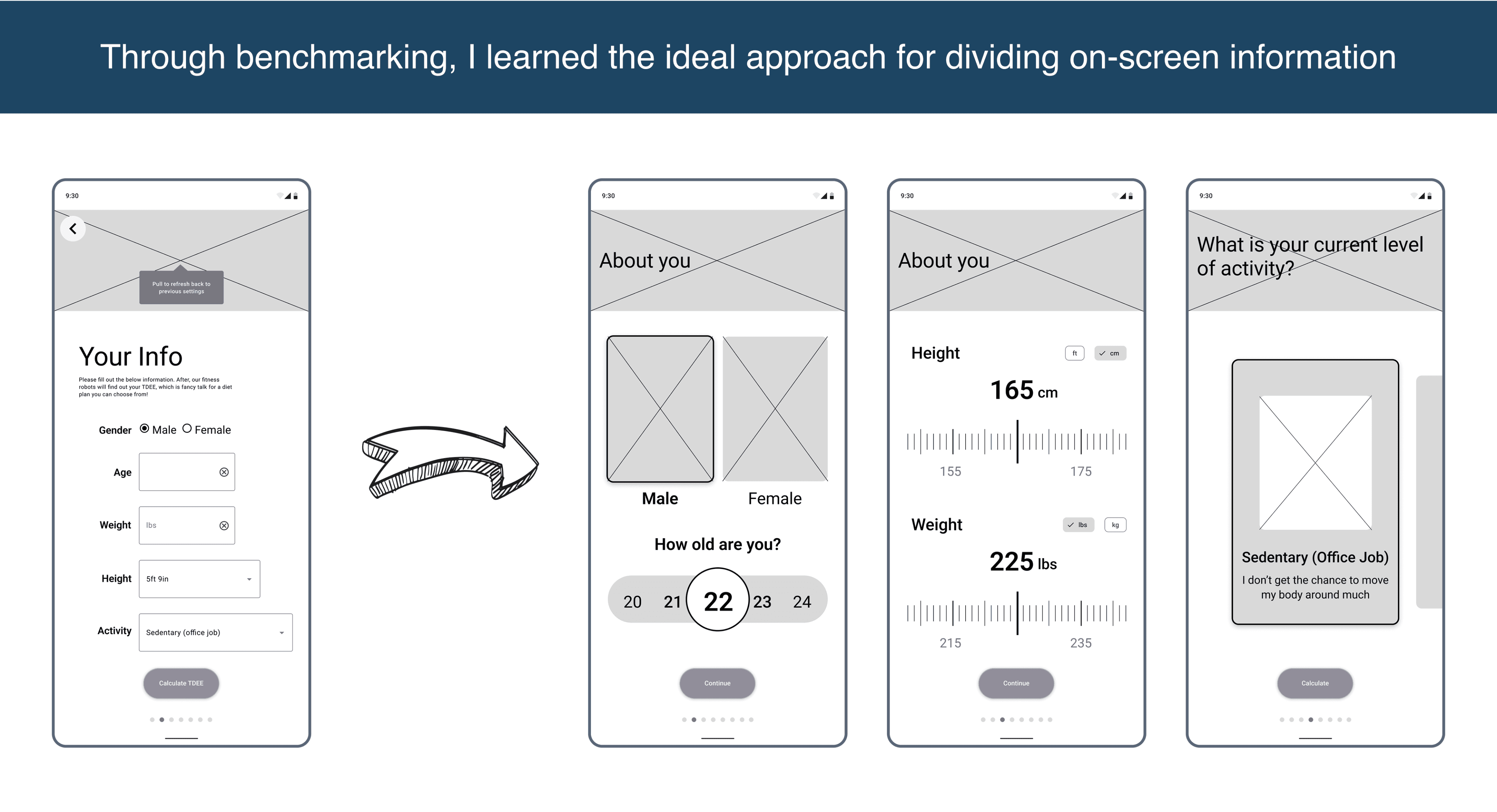 This project underscored the essence of the design process, which is adaptability and experimentation. As mentioned, the first version of FitNote's onboarding process was utilitarian, but lacked flair. Through the guidance of my mentor and a willingness to explore alternative design approaches, I discovered the essential ingredients of an engaging design that encourages user participation.